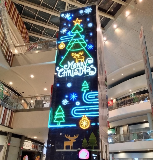 和商场外外立面灯饰画的主题风格是协调统一的,圣诞节卡通的图案造型并上极具童趣般的圣诞节字体,使人的心情非常愉悦,仿佛进入有圣诞老人的童话世界。新年中庭采用黑色与红色的主题色调,其中黑色体现中国春节节日文化的深远和浓厚,红色是中国红,寓意红红火火、吉祥如意。梅花枝头春意闹,几朵梅花几多春意。